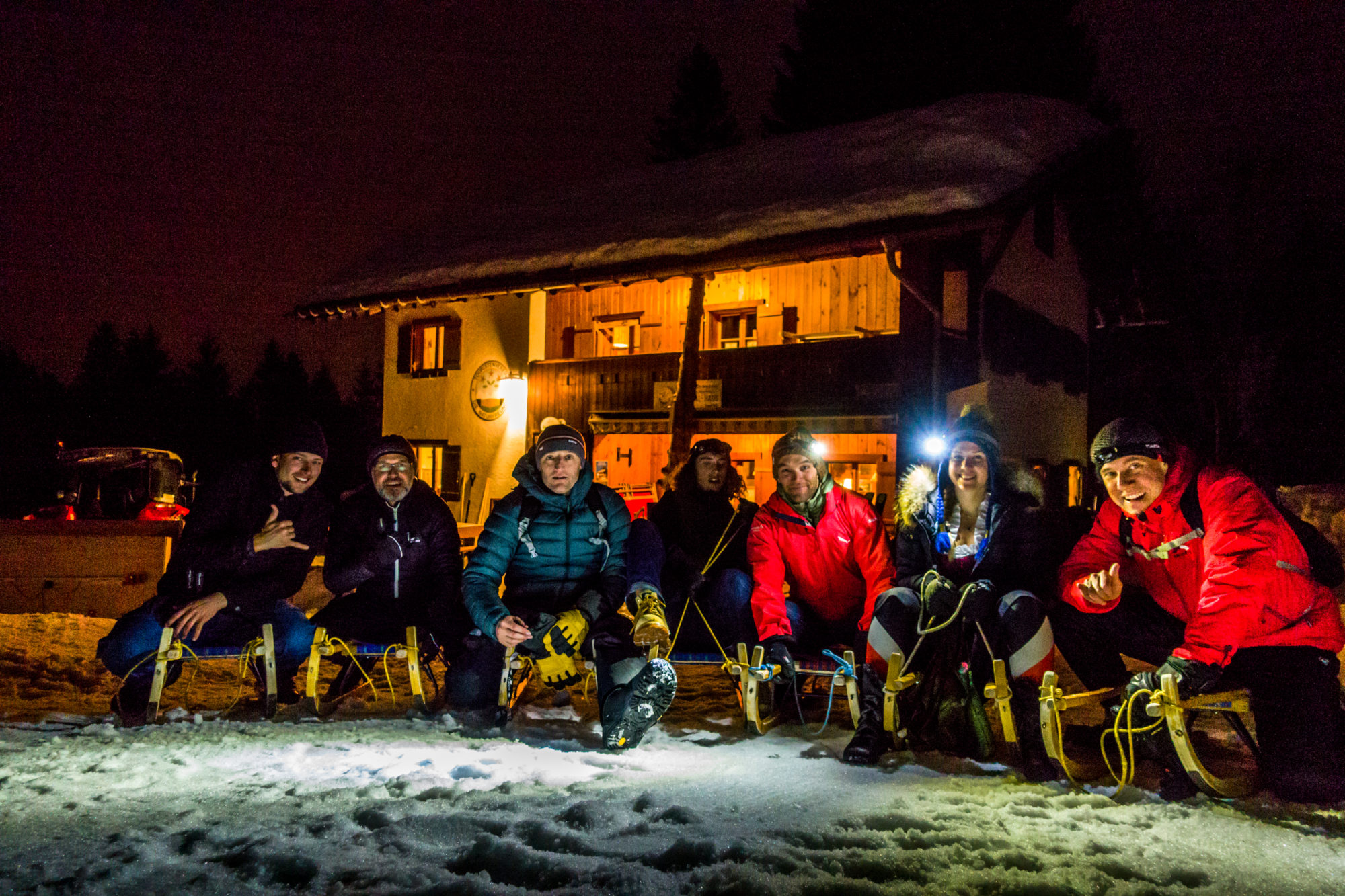 Vid middagstid blir vi ombedda att ta med oss pannlampor och rejäla skor och att mötas vid entrén klockan 18:00. Vi blir upphämtade i en bil som börjar köra upp längs de serpentinliknande vägarna i ungefär 15 minuter. Sedan stannar vi på en parkering precis bredvid skidbacken. Där står varsin typiskt alpstajlad kälke och väntar på att vi ska kasta oss ut för den mörka pisten upplyst med hjälp av pannlamporna. Snabbare än man kan säga Scheisse sitter jag med gameface påkopplat på kälken men blir hastigt stoppad av Heli som pekar upp i backen. Vi ska alltså knata upp en kort bit. Absolut, kul med lite mer fart.