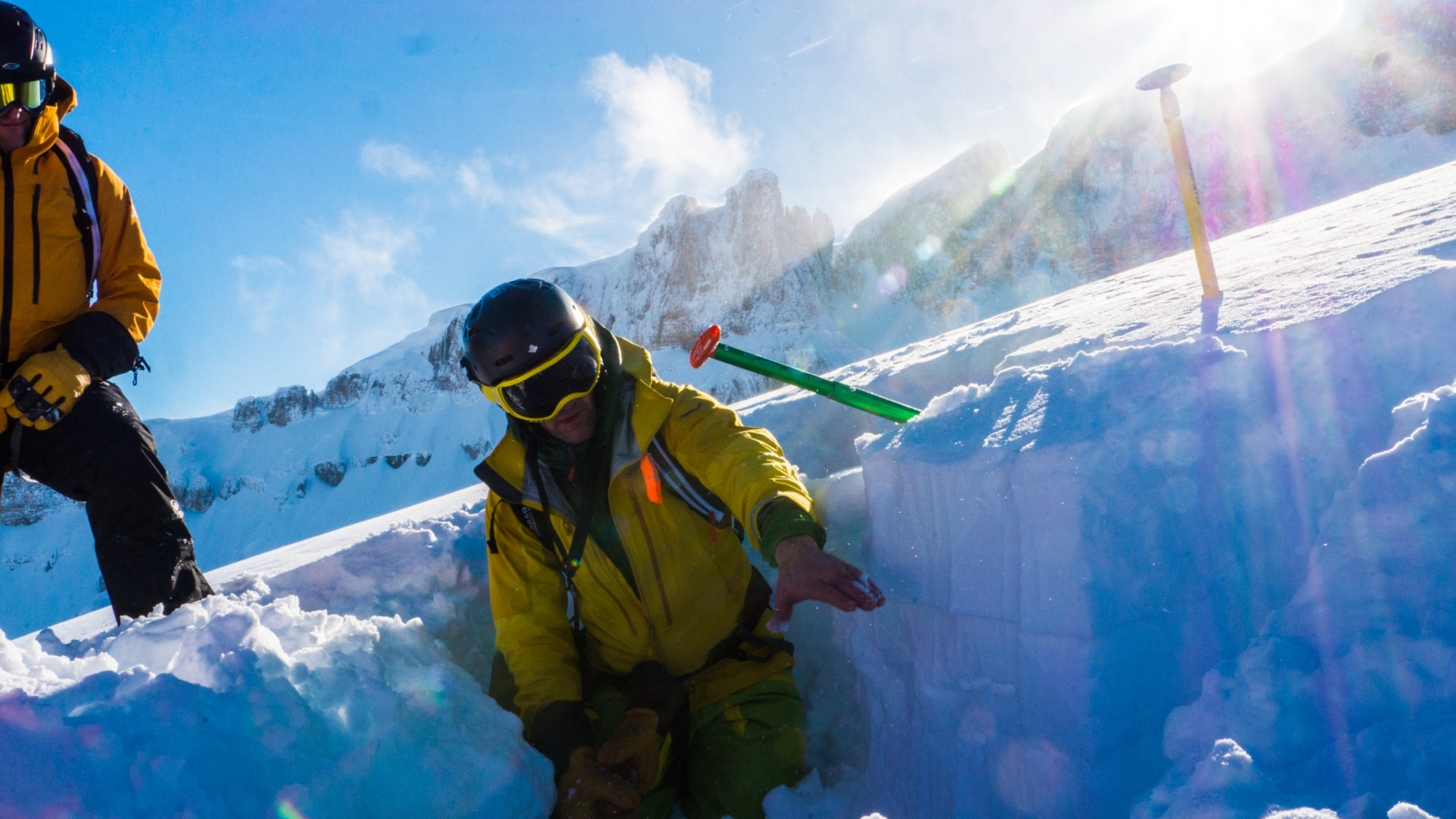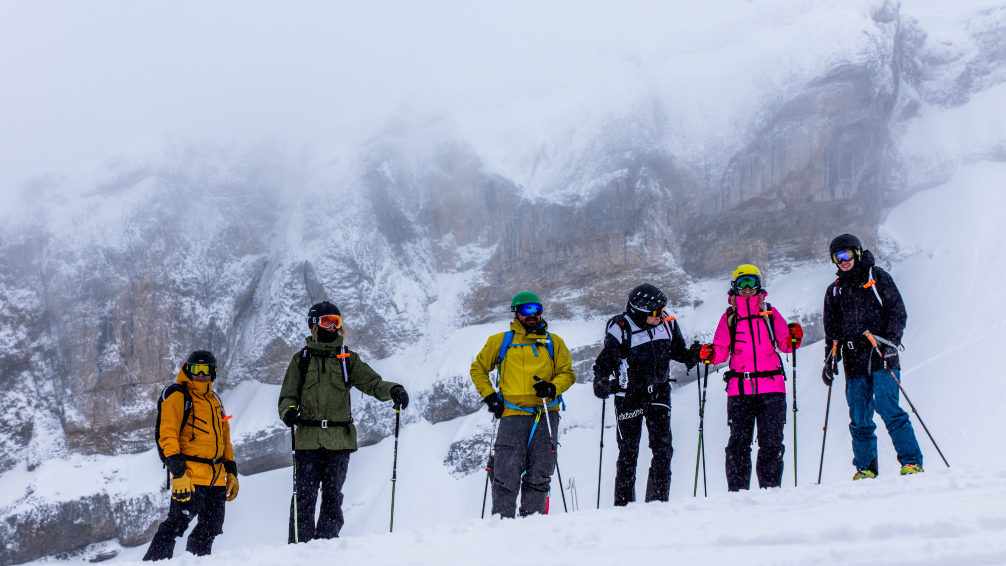 Det tar inte lång tid innan den höga höjden gör sig påmind i låren och jag känner mig snabbt ganska mycket klenare än vad en kolfiberstav gör inför en fight mot stålkanter. Senare samlas vi på en platå i lä. Det är dags för att träna söktekniker och genomgång av lavinräddning. Vi får leta tranceiver och träna på grävtekniken och också en punktlig genomgång av en räddningsaktion efter ett skreds alla stadier. Sex blöta timmar senare är vi åter tillbaka på boendet. Ett stort plus med att vara på en ”chartrad” resa som denna är att en eller sju afterski-bärs självfallet är inkluderade i paketet. Lyx.