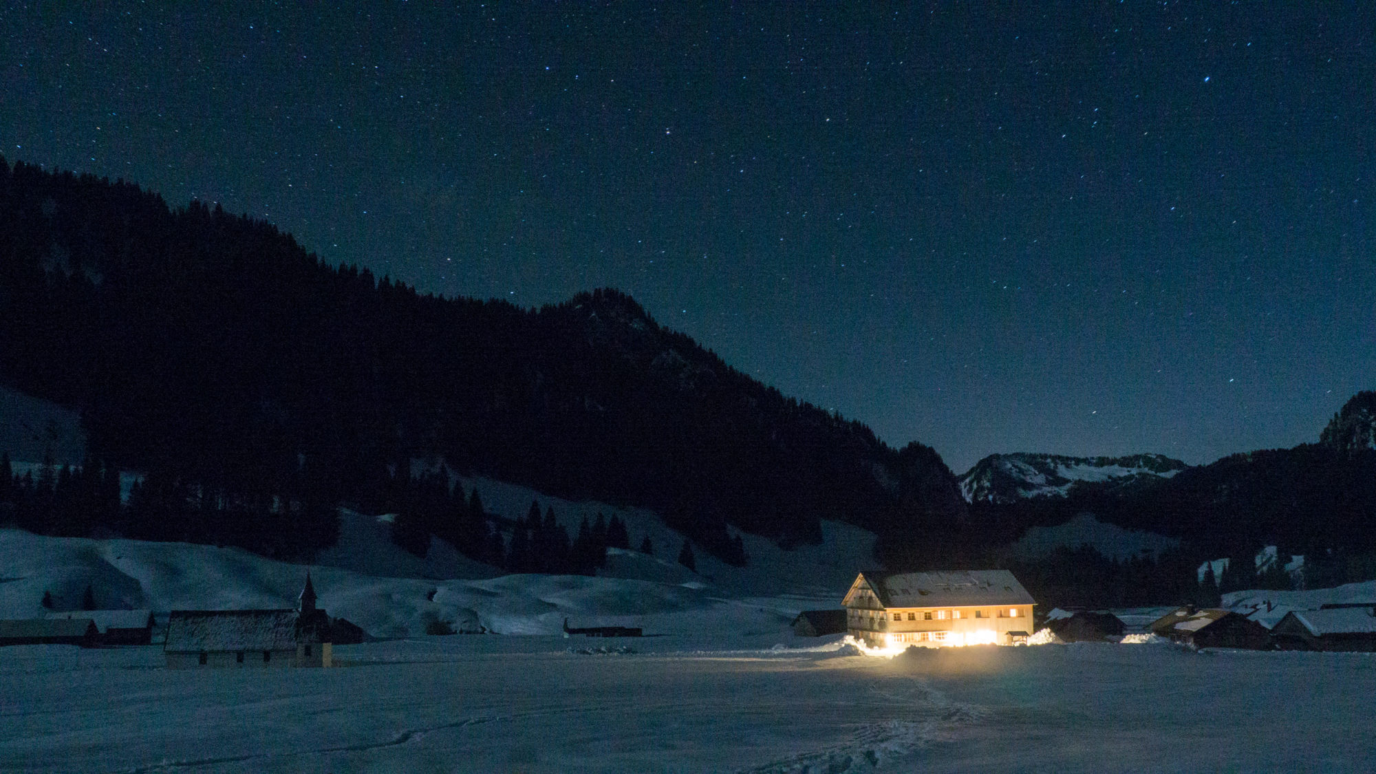 Det är mörkt när vi ankommer till en dal långt från civilisationen och helt utan anknytande liftsystem. Där står ett stort gästhus och lyser upp dalen likt fyren kastar ljus på kusten. Det känns såklart lite surt att vi inte fick chansen att ta oss skidburet hit.
