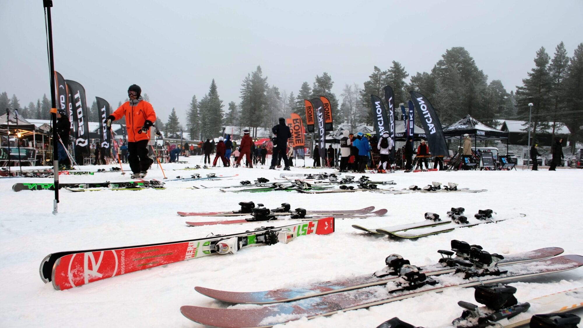Utställarna står uppradade ovanför Gustavtorget i Lindvallen. I år var det några fler snowboardmärken än vanligt, ca 7-8 stycken totalt. Alla de stora skidmärkena (25+) är förstås på plats, och sen tillkommer någon handfull tält med kläder, goggles och annan kringutrustning.