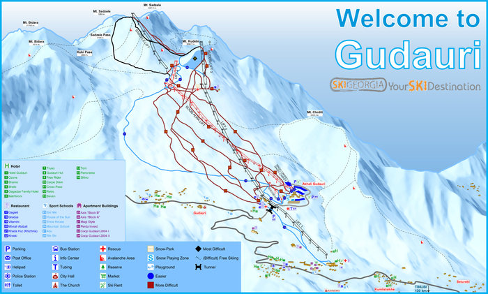 I dag finns det tre fungerande skidorter i Georgien. I Samegrelo/Zemo Svaneti-regionen ligger Mestia som så sent som 2011 besöktes av den italienska skidgurun Alberto Tomba som då passade på att klämma lite lagg tillsammans med Georgiens president. Mestia är en kulturskatt som på grund av dess kyrkor och gamla vakttorn är uppsatt på UNESCO:s världsarvslista. För att nå Mestia krävs en hel dags bilkörning från huvudstaden, om du inte tar inrikesflyget till Mestias egna flygplats.