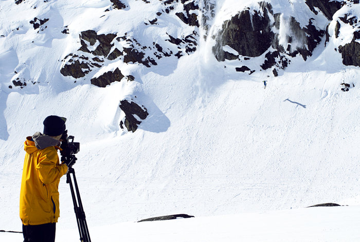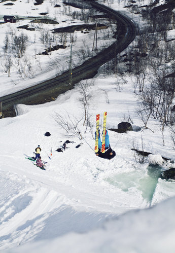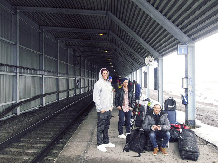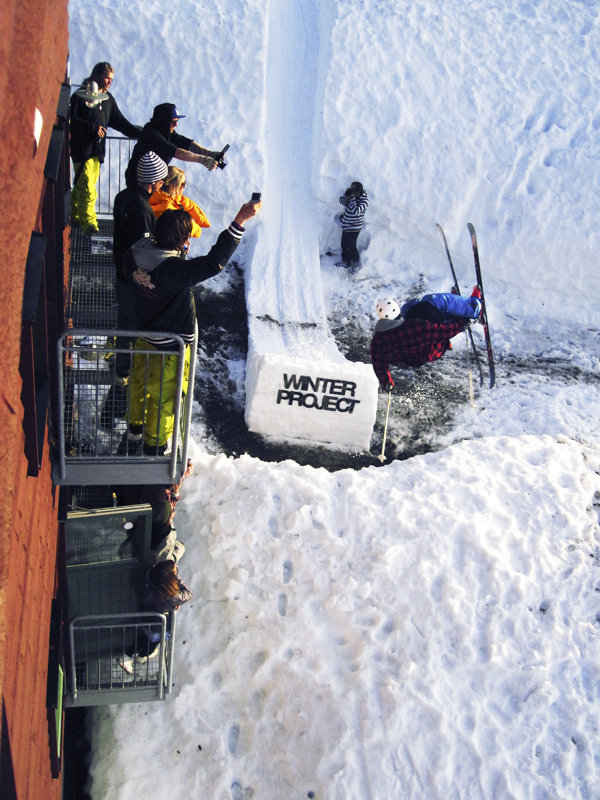 Så småningom började varma vindar komma in och över en natt förvandlades kallsnön till ett vårslaskparadis, inget vi direkt klagade över. En dag bestämde vi oss för att ta oss an det klassiska spotet Apelsinklyftan, ett perfekt roadgap över en transportsträcka. Vi hittade ett bra ställe att bygga en kick på och efter ett tag började alla ladda på rejält. Precis när vi var klara och skulle packa ihop så dök snowboardåkaren Jonathan Nilsson upp från ingenstans. Han tyckte hoppet såg roligt ut och hikade upp och körde några hopp själv och dödade spotet totalt.