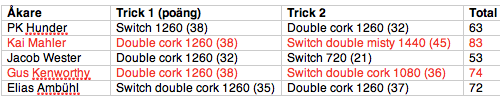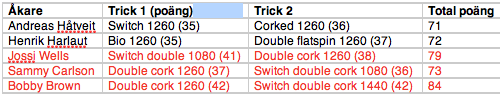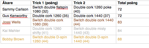 Bobby Brown tog revansch från finalförlusten förra året och återerövrade guldet. Hans trick vara både stora och landningarna cleana. På pattenterat Bobby manér landade han sina trick utan att knappt böja på benen. Tvåan Kai Mahler är verligen ett framtidsnamn och visar även att Schweiz har mer att komma med än Elias Ambühl och ostar med hål i. Sammy Carlsson kraschade i finalen och behövde hjälp för att ta sig från arenan. Freeride håller tummarna för en snabb återhämtning.