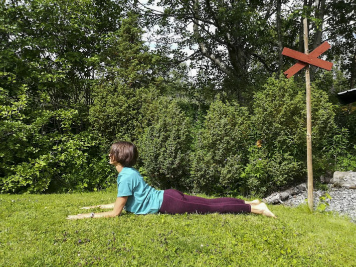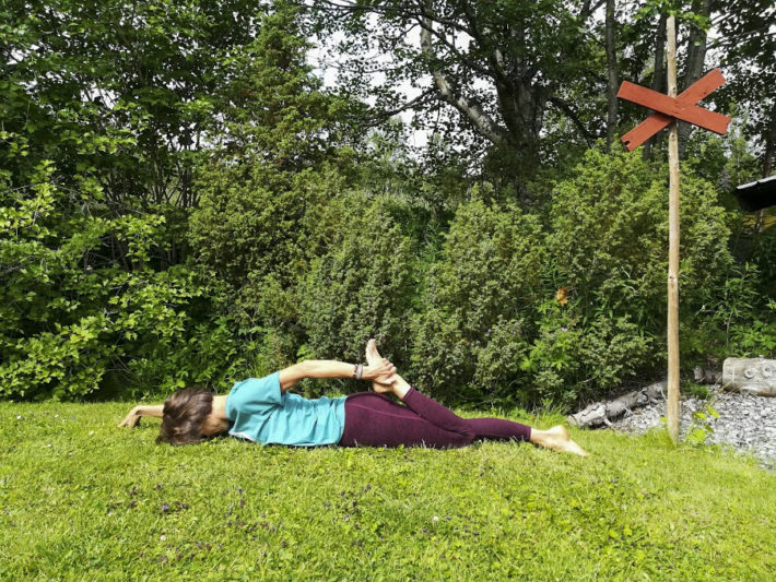 Ligg på mage. Böj vänster ben och greppa foten med vänster hand. Sträck därefter fram höger arm och håll blicken nedåt. Sträck ut höger fot och låt den ha kontakt med underlaget. Försök skapa en tyngd i höfterna och en förlängning i ryggen. Stanna 5-8 andetag och byt sedan sida.