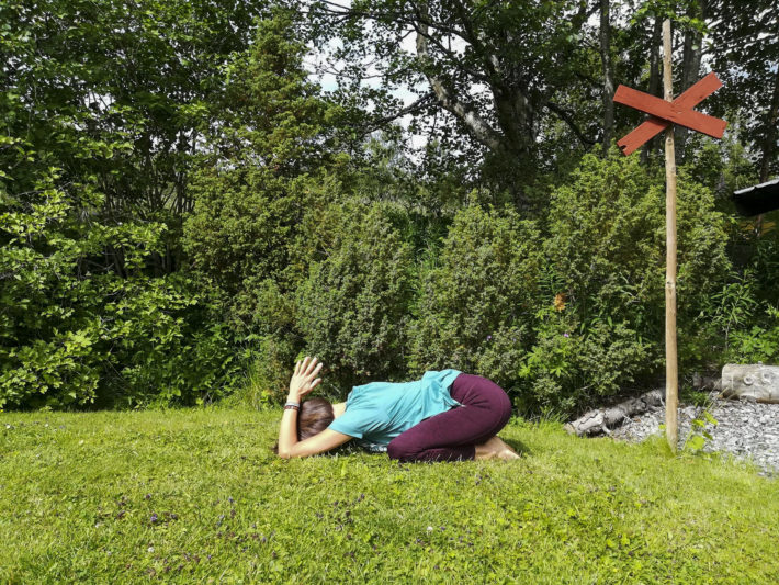 Dra in benen under kroppen, håll bredd mellan knäna och för ihop stortårna. Se till att armbågarna är i marken och för sedan ihop handflatorna ovanför huvudet med pannan vilandes mot underlaget. Stanna här i 5-8 andetag.