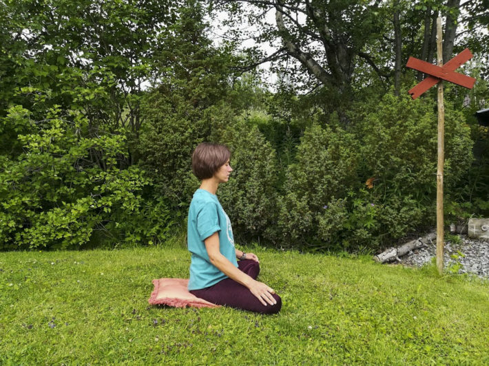 Vi börjar sittande, tippa fram höfterna och se till att vara mjuk i axlar, hals och nacke. Försök att hitta en avslappnad men stolt hållning. Sitt gärna på något så att ryggen blir naturligt rak och skapa en öppning i bröstet genom att låta axlarna falla bakåt och nedåt. Slut ögonen och reflektera över andningen, försök släppa ned andningen i magen och mot nedre delen av ryggraden. Stanna här tills andningen är lugn, jämn, bred och djup.