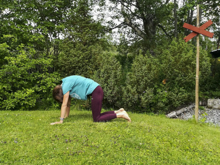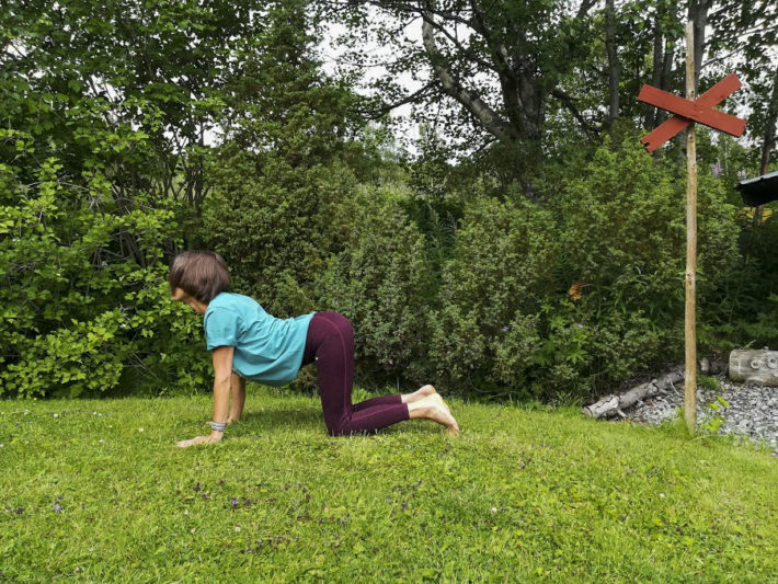 Ha kvar kontakten mot underlaget med starka och raka armar. Andas ut och hitta in i en svank. Upprepa katten och kon under några minuter. Gör dessa långsamt och se om du kan upptäcka alla kotor längs ryggraden.
