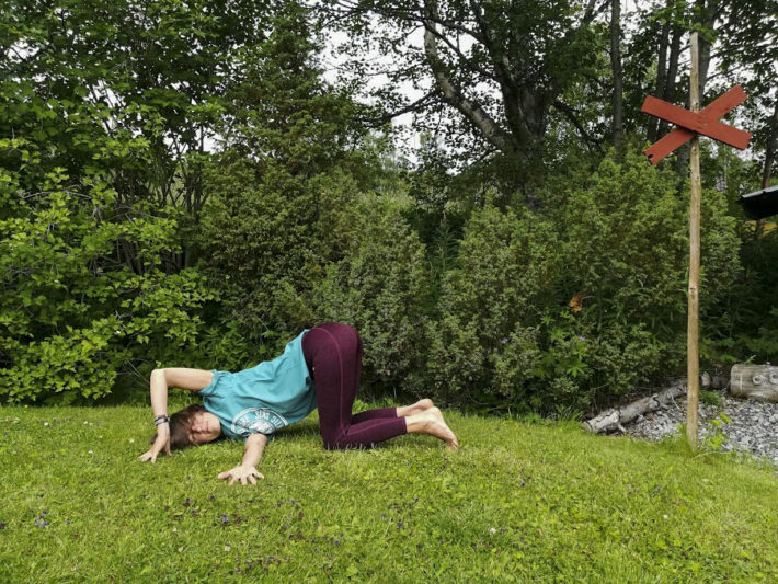 Skapa en förläggning i kroppen och aktivera mage, ben och armar. Stanna 5-8 andetag och byt sedan sida.
