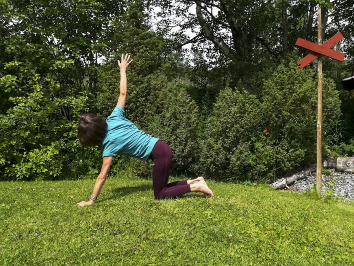 Pressa ned vänstra handens fingertoppar mot underlaget, tår och knän är i fortsatt kontakt nedåt. Behåll längden i ryggen och öppna upp höger sida genom att sträcka upp vänster arm. Försök därefter att sträcka ut ytterligare från mitten av bröstkorgen upp till fingertopparna.