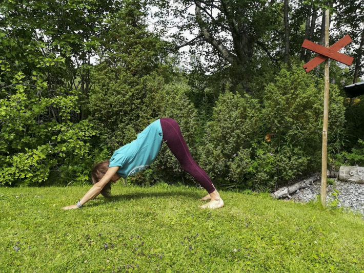 Stå på alla fyra med axelbredd mellan händerna, spreta med fingrarna och pressa nedåt. Skjut sedan kroppen bakåt och uppåt. Lyft gärna upp hälarna och böj på knäna och försök att hitta till en naturlig svank med ryggen. Dra axlar och skulderbladen bort från öronen och aktivera nedre delen på magen. Ha gärna en bredd mellan fötterna som är något större än höftens bredd, för att skona ländryggen. Stanna i ”Hunden” under några andetag. Genom andetaget så ska kroppens spänningar släppa, så låt bli att aktivt sträcka ut och låt istället kroppen själv få slappna i sin egen takt.